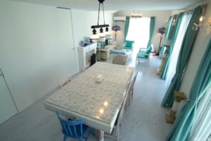 シンボルとなるブルードームと丸みを帯びた外壁、ダイニングにはなんとフランスから輸入したというビリヤード台兼ダイニングテーブル。週末しか来ないということで、妻がバカンスを楽しむためにキッチンは最低限の作りとなっている。