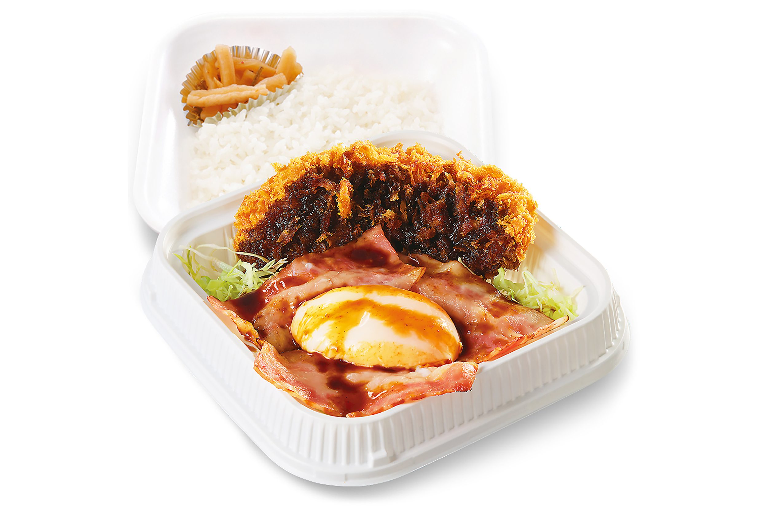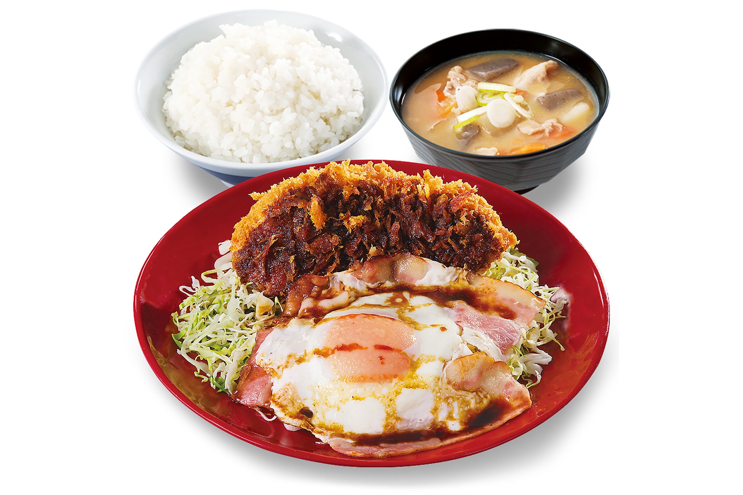 酸味と辛みが相まって深みを増したソースがきめてである根強い人気の『ソースカツ丼(梅)』に、 ベーコンエッグを添えた斬新かつ食べやすいメニューとなっている。
