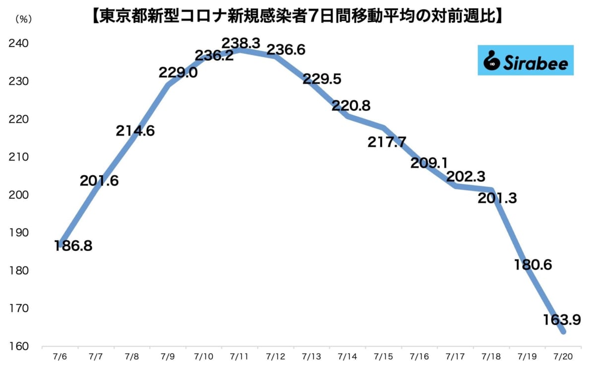 直近7日間の移動平均は16,649.3人に増加。増減の度合いを表す対前週比は163.9%と9日連続で下落したが、31日連続で100%を上回った。