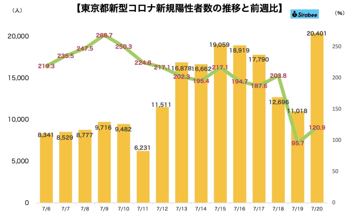 この日は前週同曜日(7月13日・16,878人)から3,523人増。2日ぶりに前週比増となった。先週水曜日と比較すると120.9%。